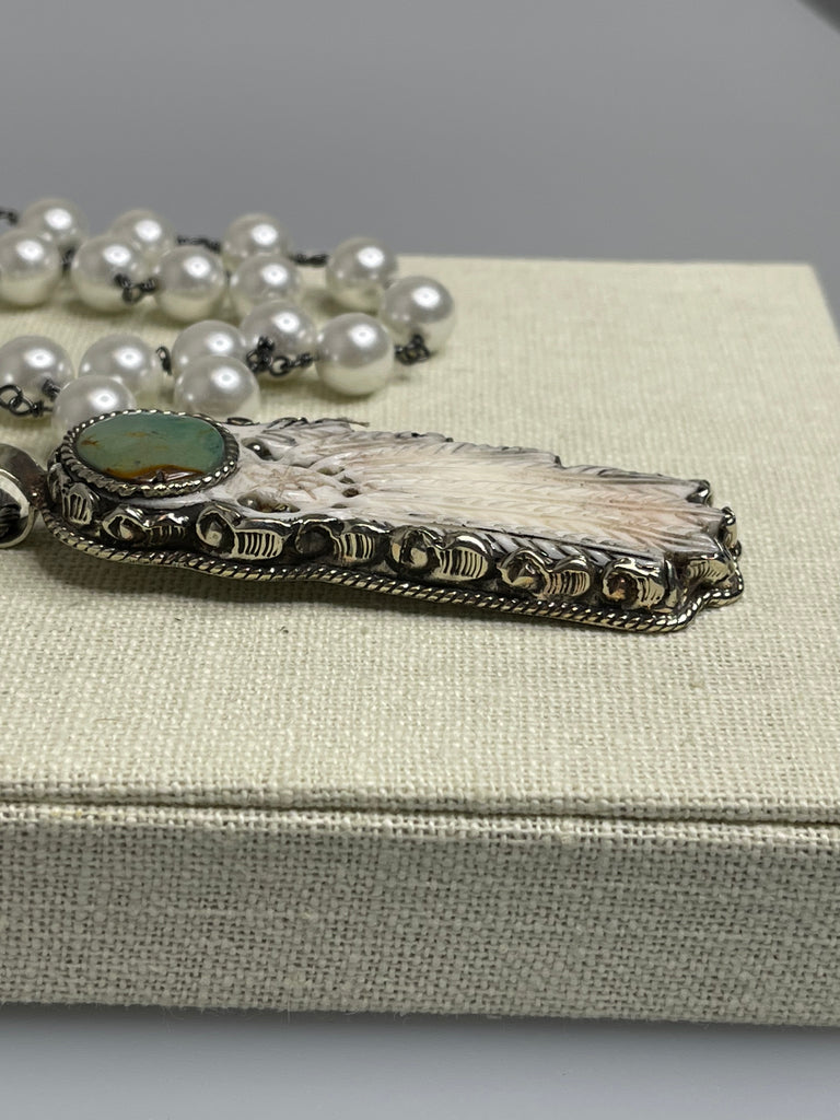 Hand Carved Feather Headdress on Bone Pendant with a Stainless and Pearl Chain Necklace