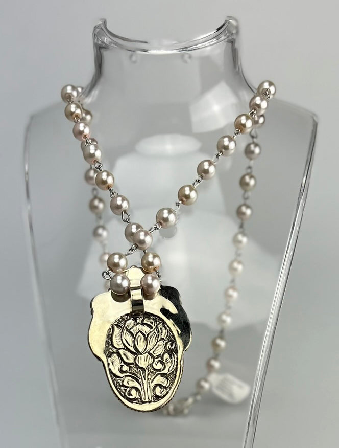 The bezel is beautifully stamped on the back. The stainless steel and pearlnchain is 24" and has a simple sterling silver lobster clasp.