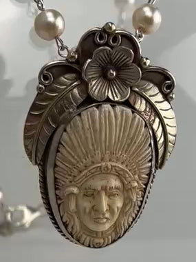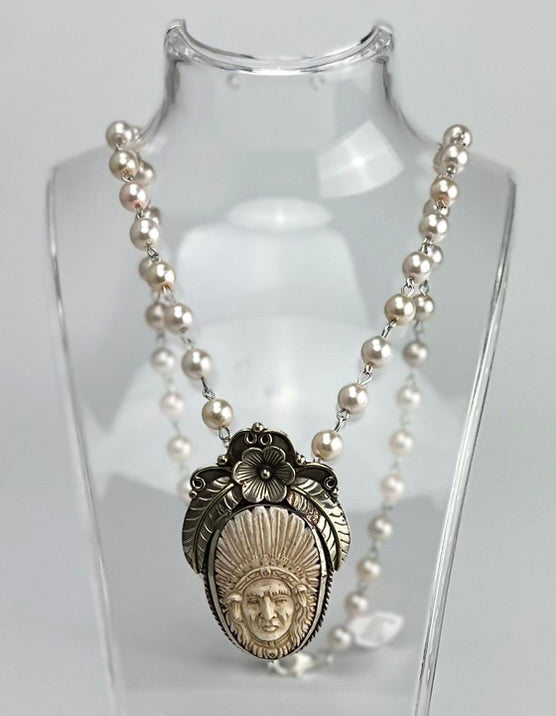 Hand Carved Bone Indian Chief Head Pendant with Flower Crown with a 24 inch Hand Vintage Porcelain Glass Pearl Chain