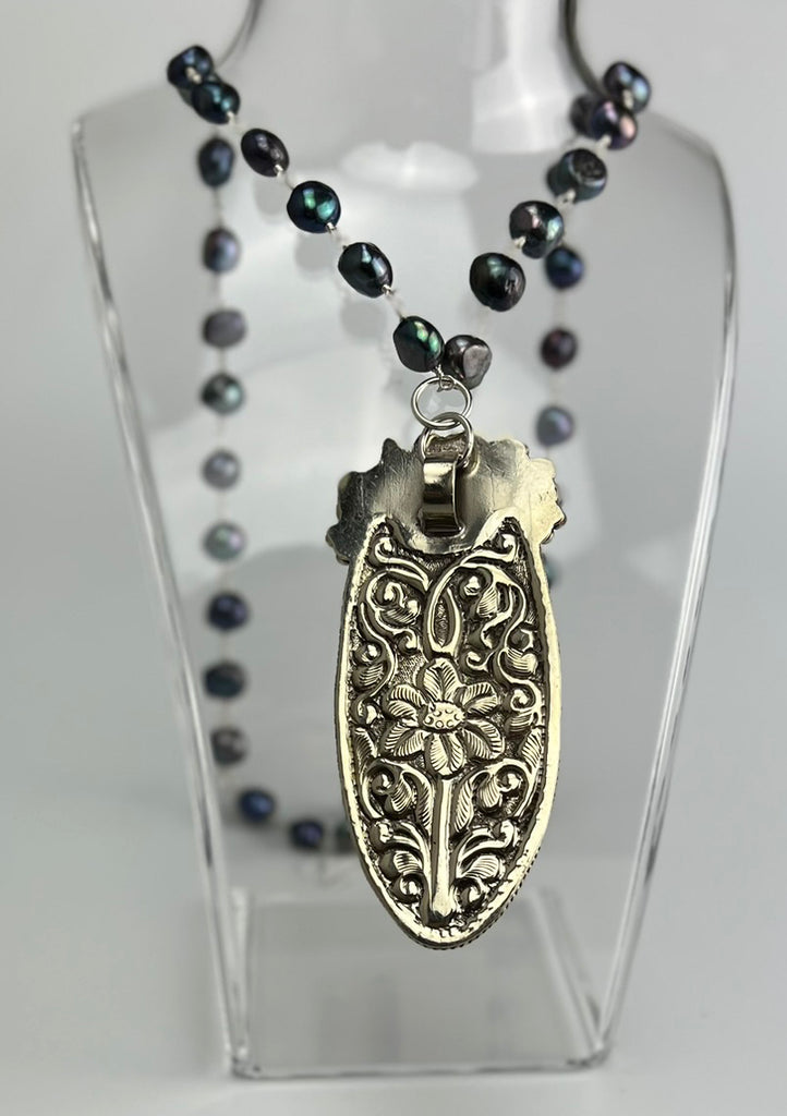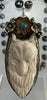 Embrace the wild with our unique Hand Carved Wolf Head Bone Pendant. Adorned with a floral crown and a stunning turquoise stone, this pendant exudes a sense of untamed beauty. Paired with a 24 inch vintage glass pearl necklace, it's the perfect blend of elegance and edge.