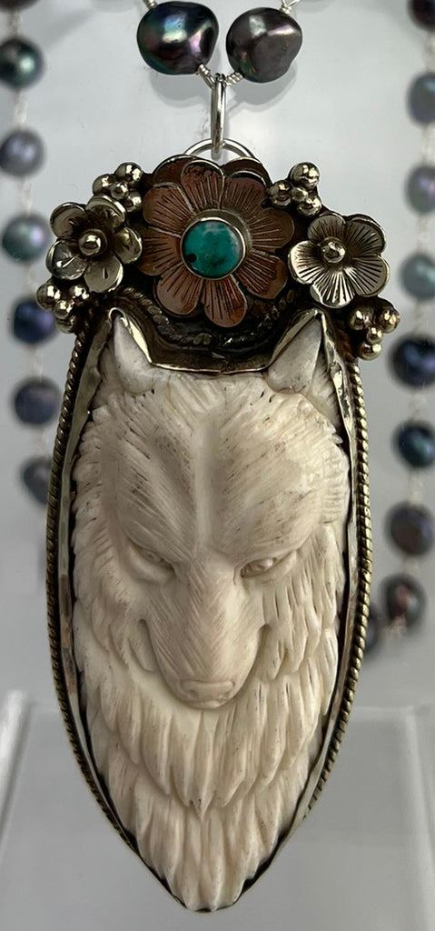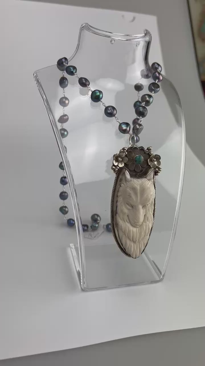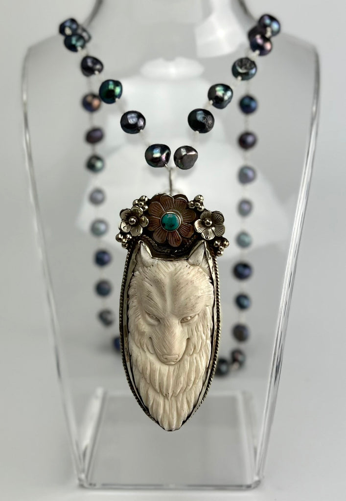 Hand Carved on Wolf Head Bone Pendant with Floral Crown and Turquoise Stone with a 24 inch Vintage Glass Pearl Necklace