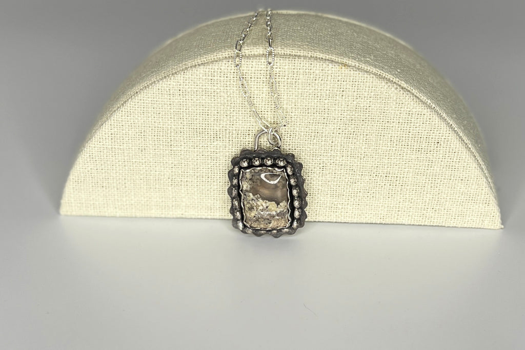 This stunning moss agate is set on a textured sterling silver backplate and is adorned with silver balls. The chain is a notched sterling silver paperclip style and 20" inches in length.