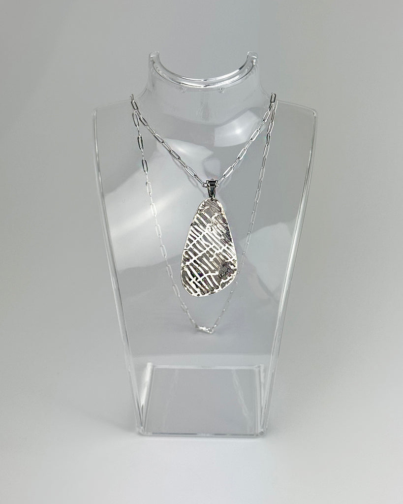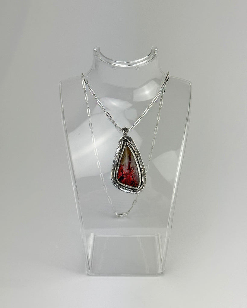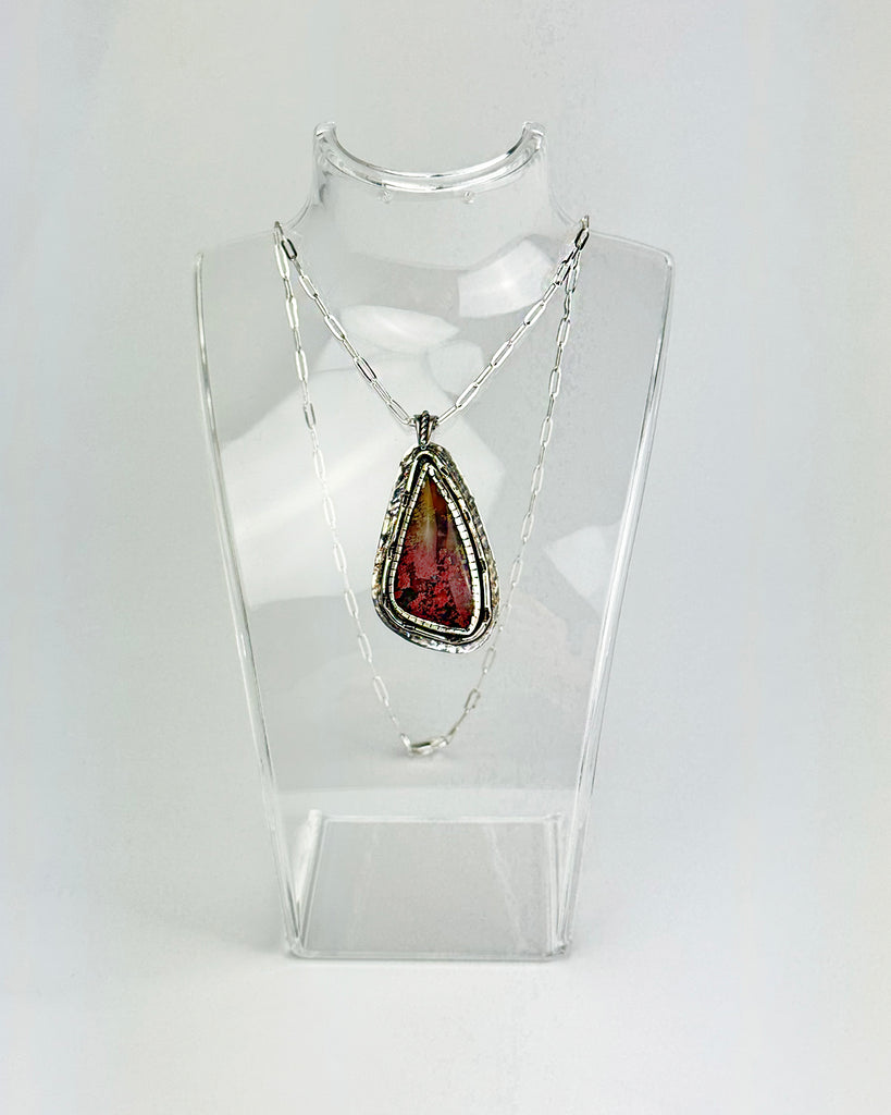 This exquisite pendant features a 35.3 ct Moss Agate, reminiscent of autumn leaves with rich hues of gold, russet pink, and brown. Set in sterling silver, the stone is framed by a meticulously handcrafted gallery wire that enhances its natural allure. The textured back showcases a bold tree relief, adding an artistic touch. Suspended from a 22-inch sterling silver paperclip chain, the pendant measures 2 inches in length and 1.5 inches in width, embodying timeless elegance.
