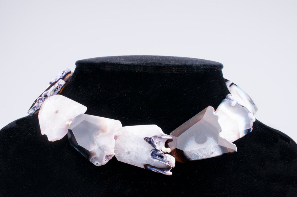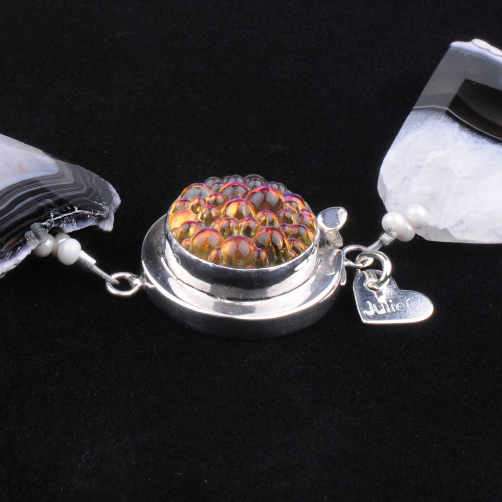 Stunning iridescent Smokey Quartz and Amethyst rock gemstone beads strung to choker length. Each bead is separated by seed pearls to help the necklace have movement. The clasp is made of Sterling Silver a dichroic glass. Choker length, 18".