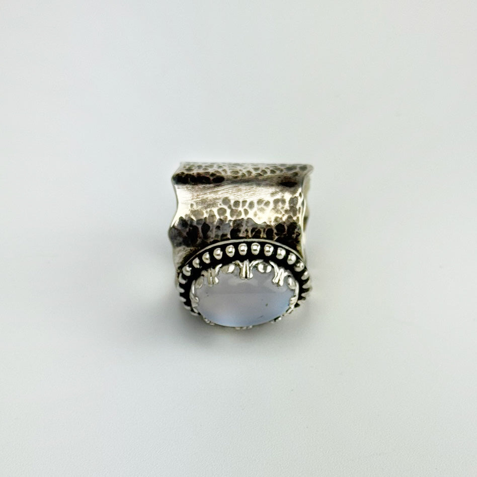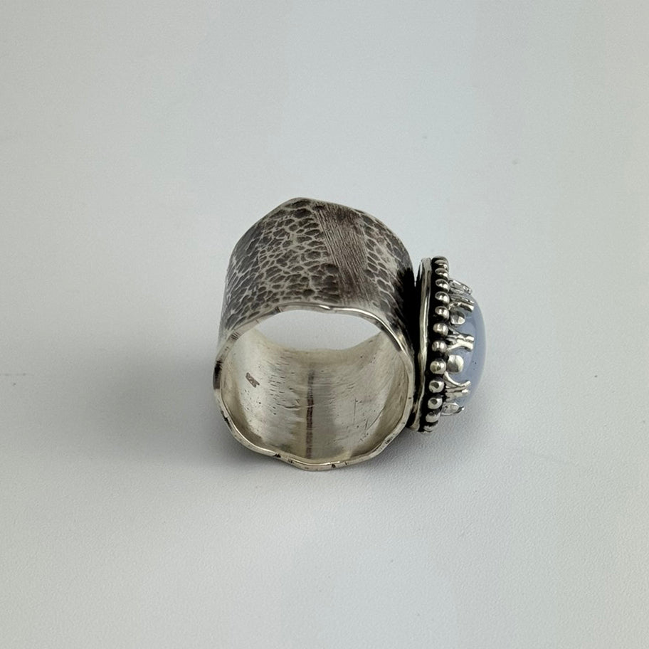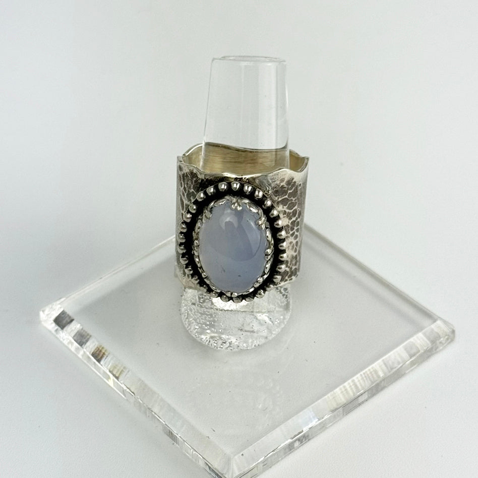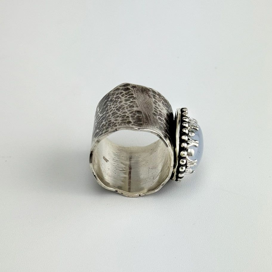 Embrace calming vibes with this playful Blue Lace Agate ring, featuring a 7.3-carat stone set on a bold sterling silver wide band. Sized at 9.5, it’s the perfect blend of comfort and style, adding a cool splash of color to your everyday look. Brighten your day with a little lace of blue!