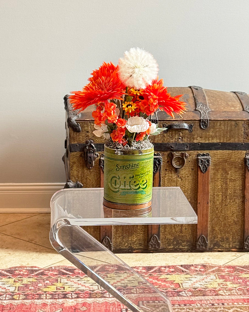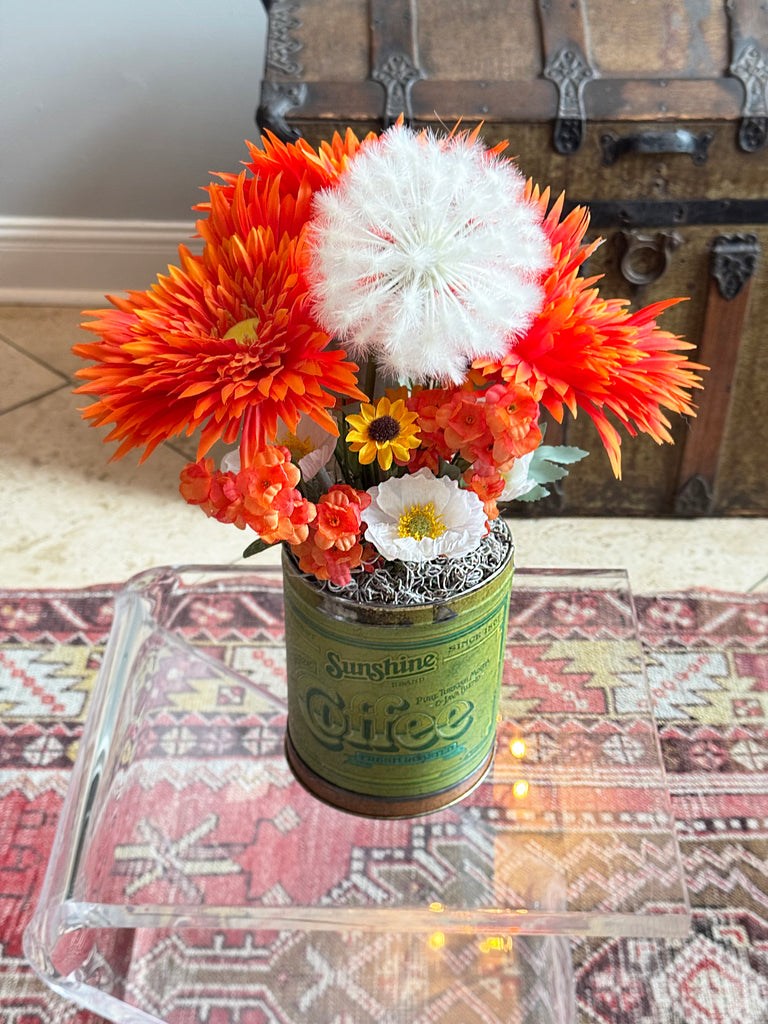 Indulge in the charm of summer with this exquisite floral masterpiece! Carefully arranged in a Vintage Sunshine Brand Coffee Tin from the 1970s, this vibrant display features 3 large bright orange dahlias and a smattering of small yellow sunflowers and white poppies. There is a feature white dandelion flower in the center. The arrangement is a compact 17" and  this creation includes the tin's lid, preserving its vintage integrity. Transform your home and table with this one-of-a-kind arrangement! Don't miss out on this unique opportunity to elevate your decor. The overall height is 17" and the tin base is 5" wide" x 6" tall.