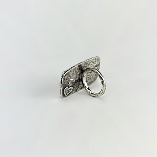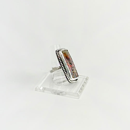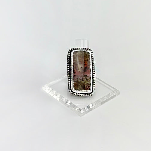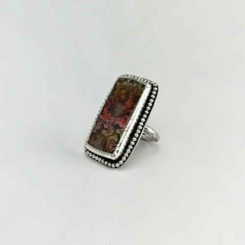 Add a pop of color to your look with our Multi-Colored Moss Agate and Sterling Silver Statement Ring. The striking rectangular moss agate is beautifully contrasted with a textured silver backplate and intricate bezel. Playful silver balls add a touch of whimsy to this unique piece.