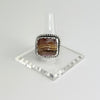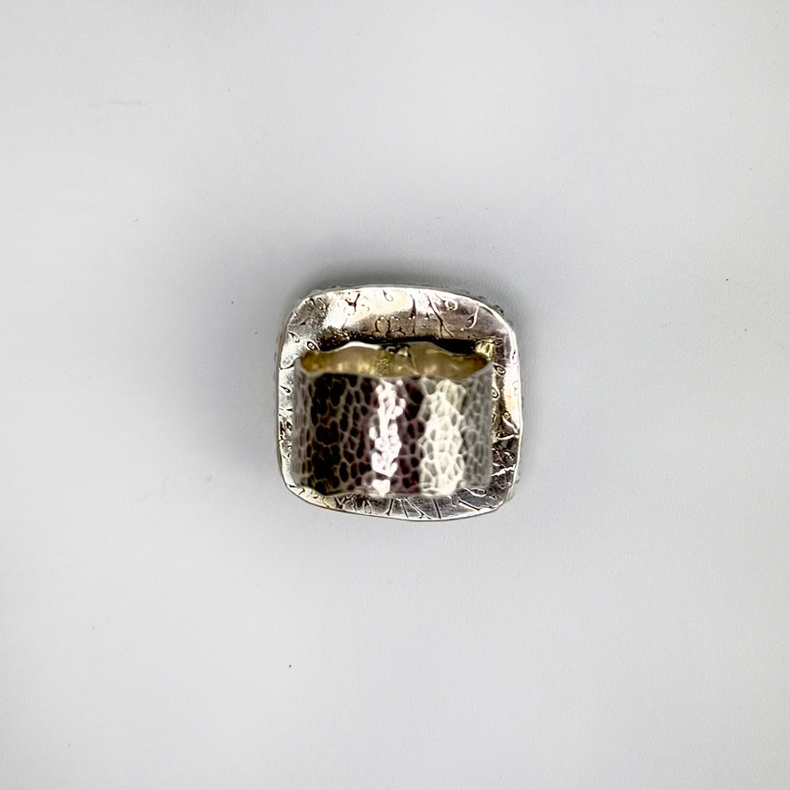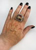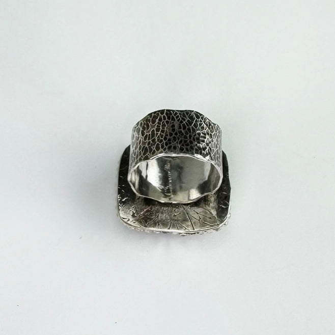The overall dimensions are approximately 1" x 1". Size is US 8.5, but with the wider band will fit more like an 8.
