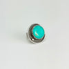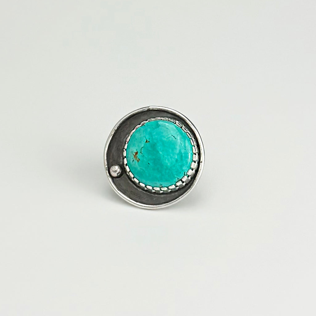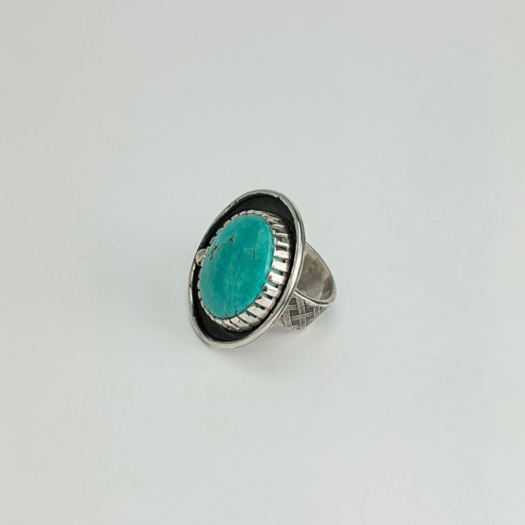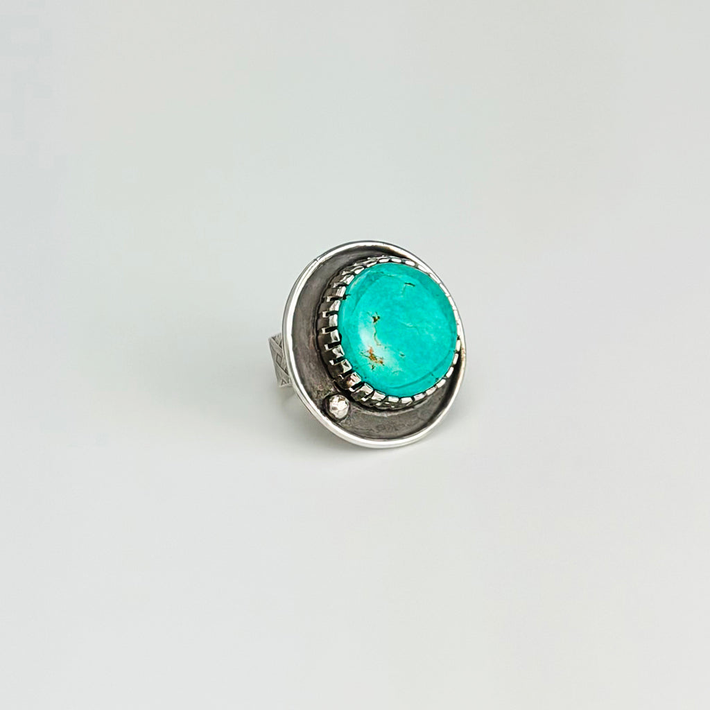 This stunning statement ring showcases a magnificent 35.45 carat round turquoise from the legendary Tyrone Silver City, New Mexico Mine, prized for its vibrant color and authentic character. Set in textured sterling silver, the wide band features intricate cross-hatch detailing that catches light beautifully, while the back displays an embossed western daisy pattern for added artistry. Sized at 8 (fits best at 7 3/4), this modern western piece makes a bold, sophisticated statement for anyone who appreciates genuine gemstones and crafted silverwork.