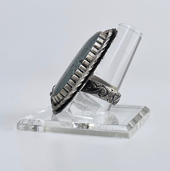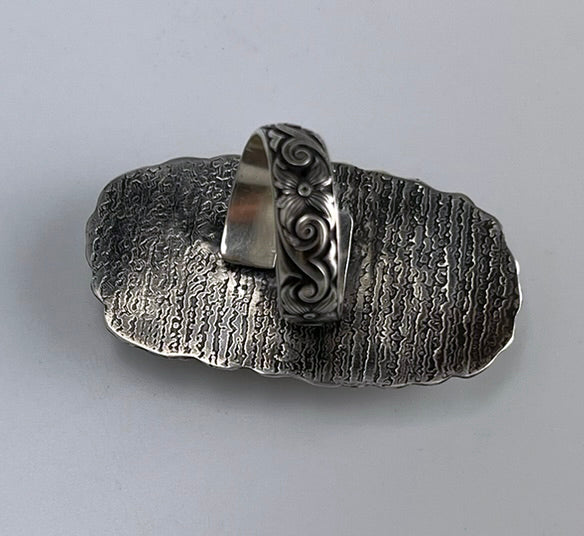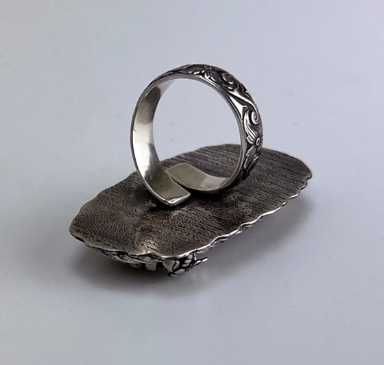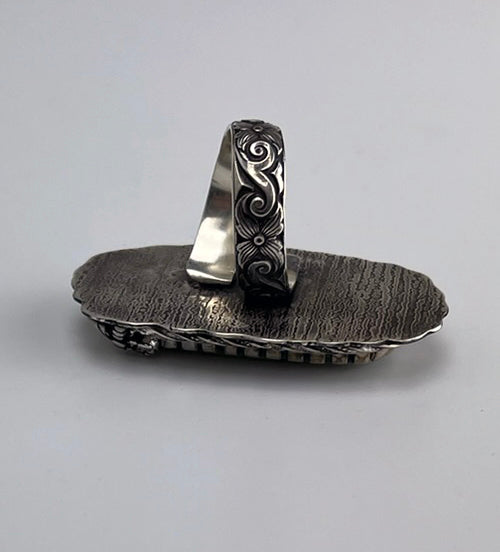 Experience the stunning beauty of the Candeleria Hills with our Variscite Sterling Silver Ring. Featuring a unique Castellated Bezel and a beautifully Decorative Adjustable Band, this ring is truly a masterpiece.