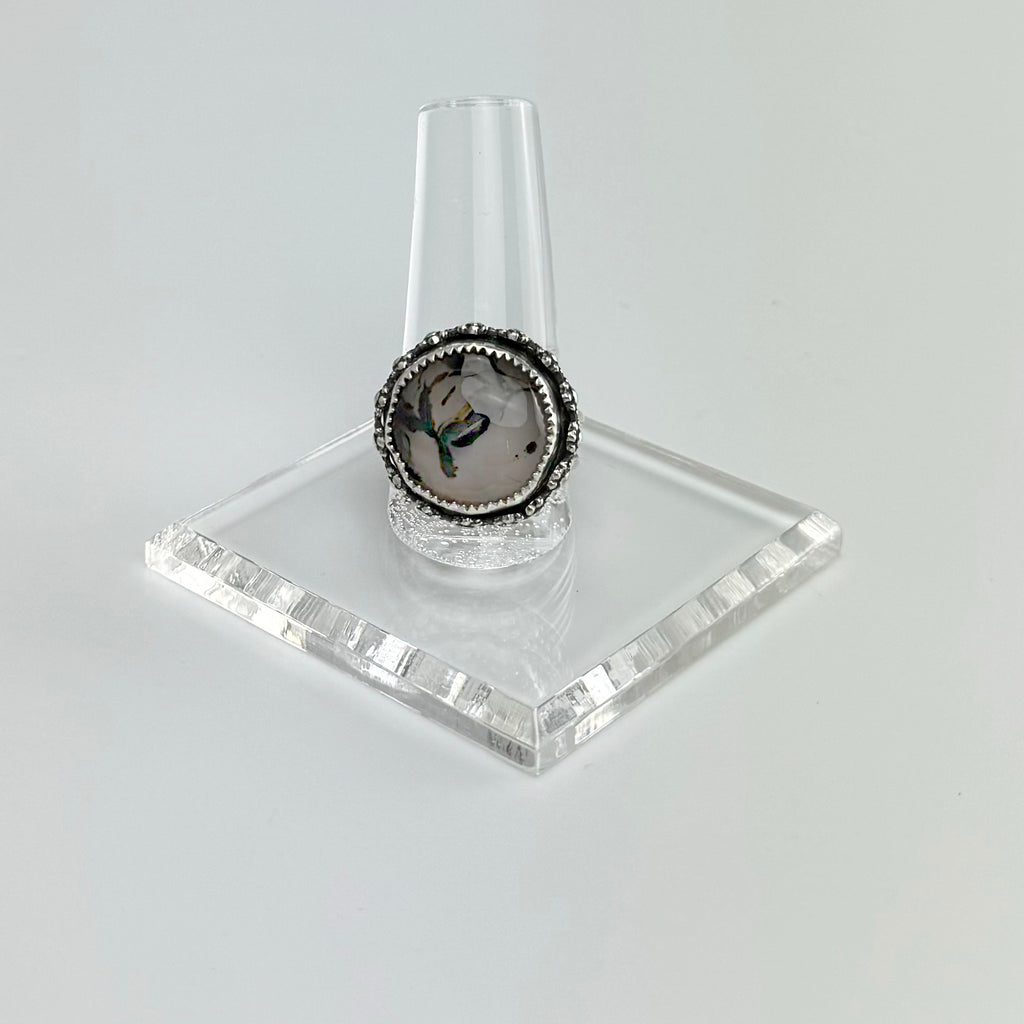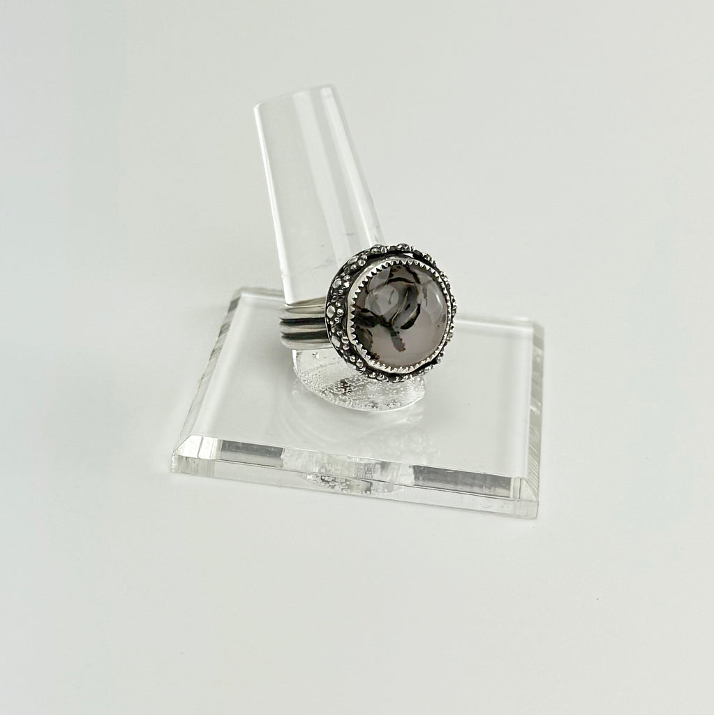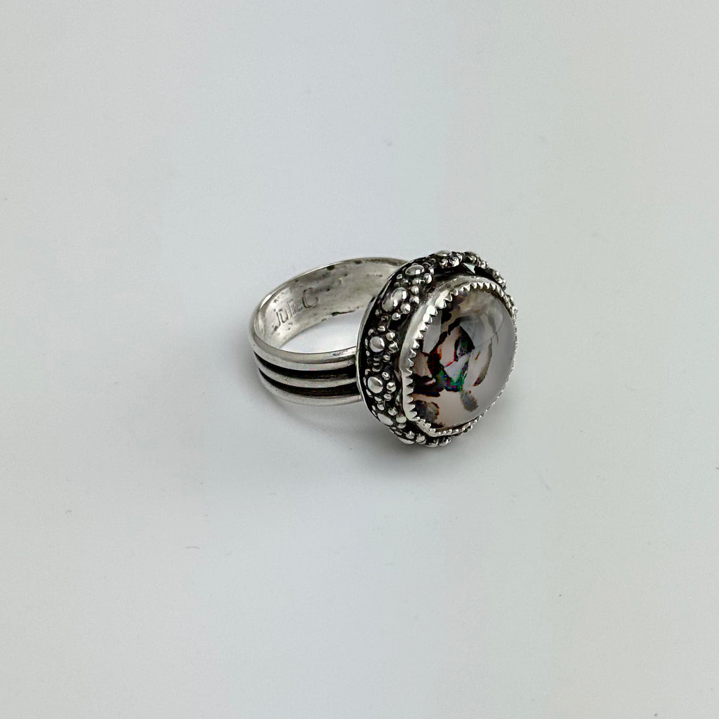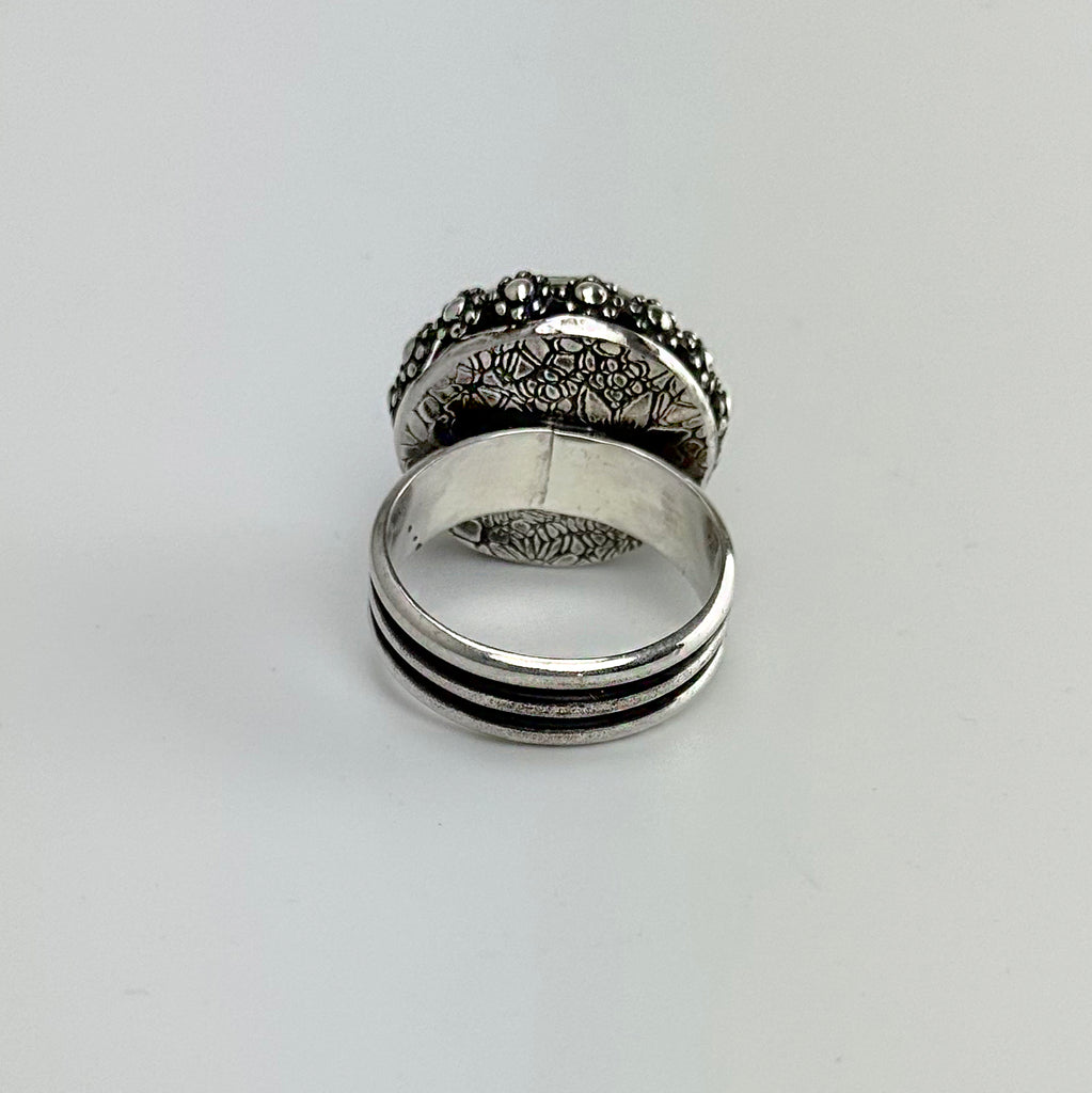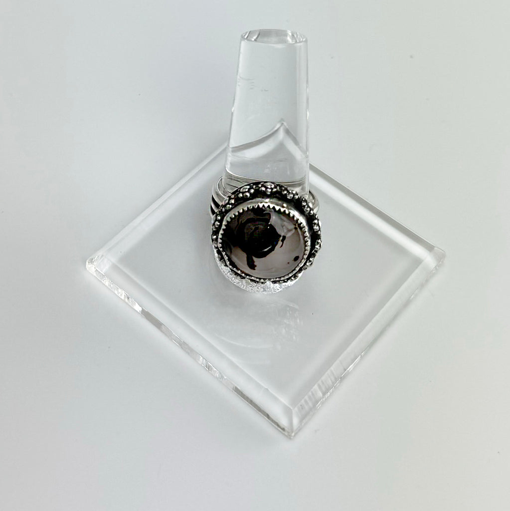 Unleash your adventurous side with this Montana Agate Sterling Silver Round Stone Ring. Featuring a uniquely crafted silver berry wire design and a mesmerizing round natural Montana Picture Agate, this sterling silver ring is the perfect addition to your jewelry collection. Embrace the beauty and intricacy of nature with this bold and daring statement piece. The ring size is a US 8.5 made on a wide band. Because it is a wide band this ring will fit a size US 8 to 8.5 best.