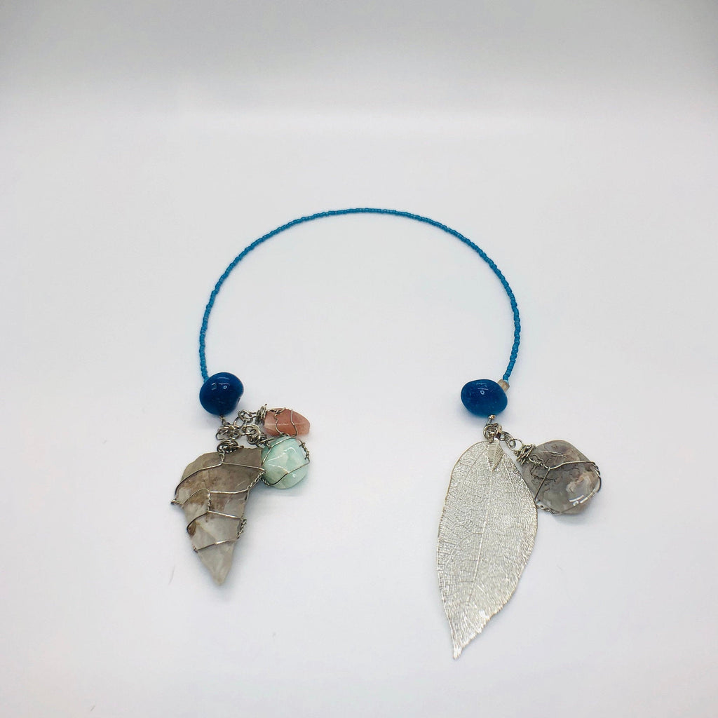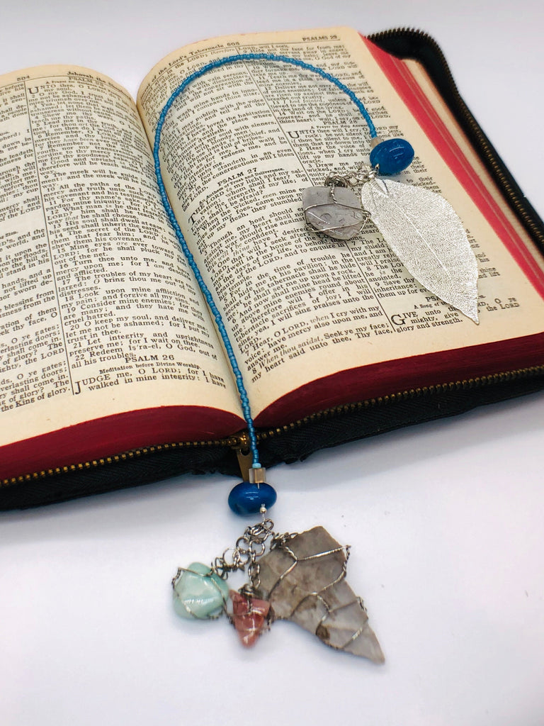 New for summer reading or a special gift for those terrific mom's we know and love. This ocean themed bookmark not only offers beautiful aesthetics but numerous soothing qualities all to mark your place in your favorite book. Featured stones are Jasper, Quartz, Agate, and each end features on one side a large arrowhead and the other a large silvertone leaf. It measures approximately 16" long.