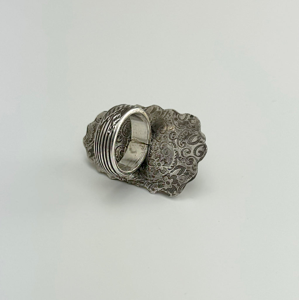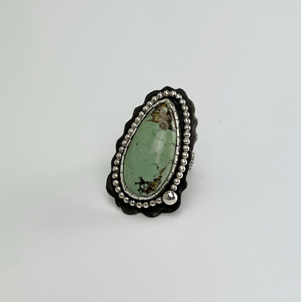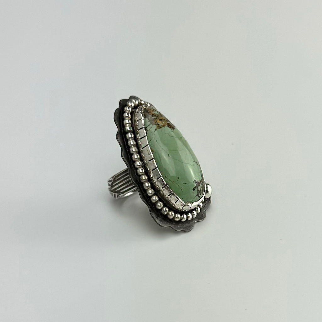 This opulent turquoise gemstone (26.65 cts) features a teardrop shape and measures approximately 2" in length, set within a .75" width. It is adorned with a castellated bezel and accentuated by a grandiose beaded wire and even larger single bead, all crafted in elegant sterling silver. The back showcases a textured western daisy pattern, while the band material is .50 wide and embellished with intricate banding and a striking X design. A true statement piece, available in size 7.5. This is a wide band ring sized at US 7.5 and will best fit a size US 7.