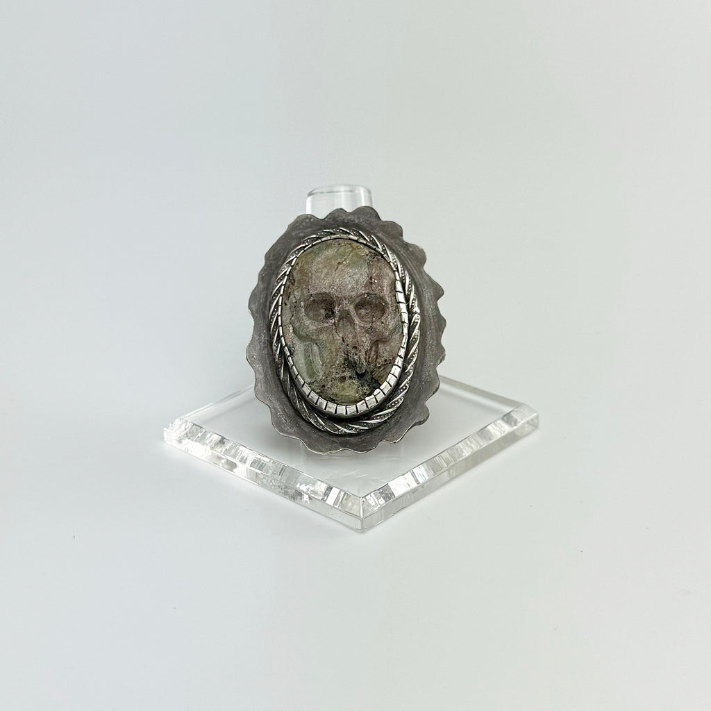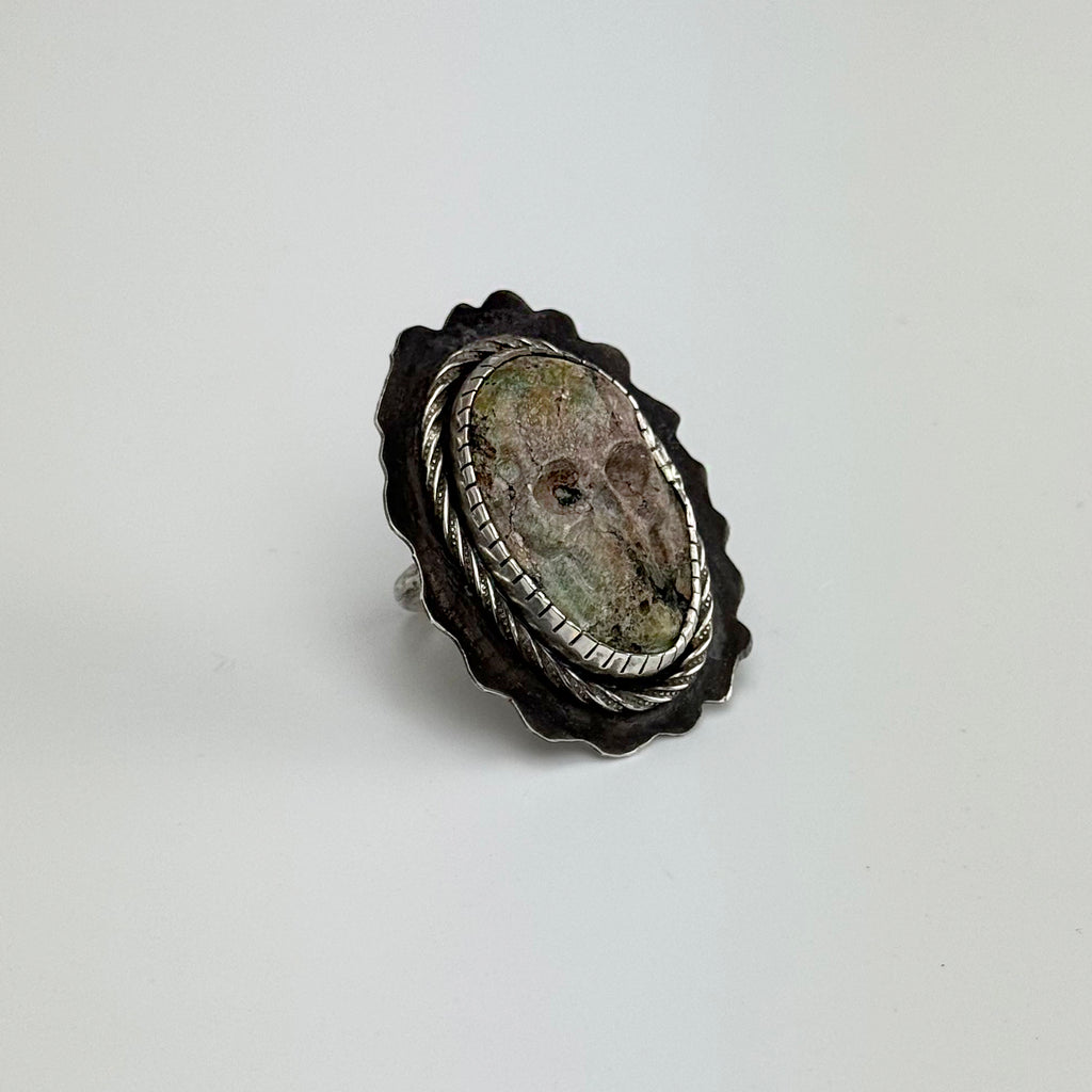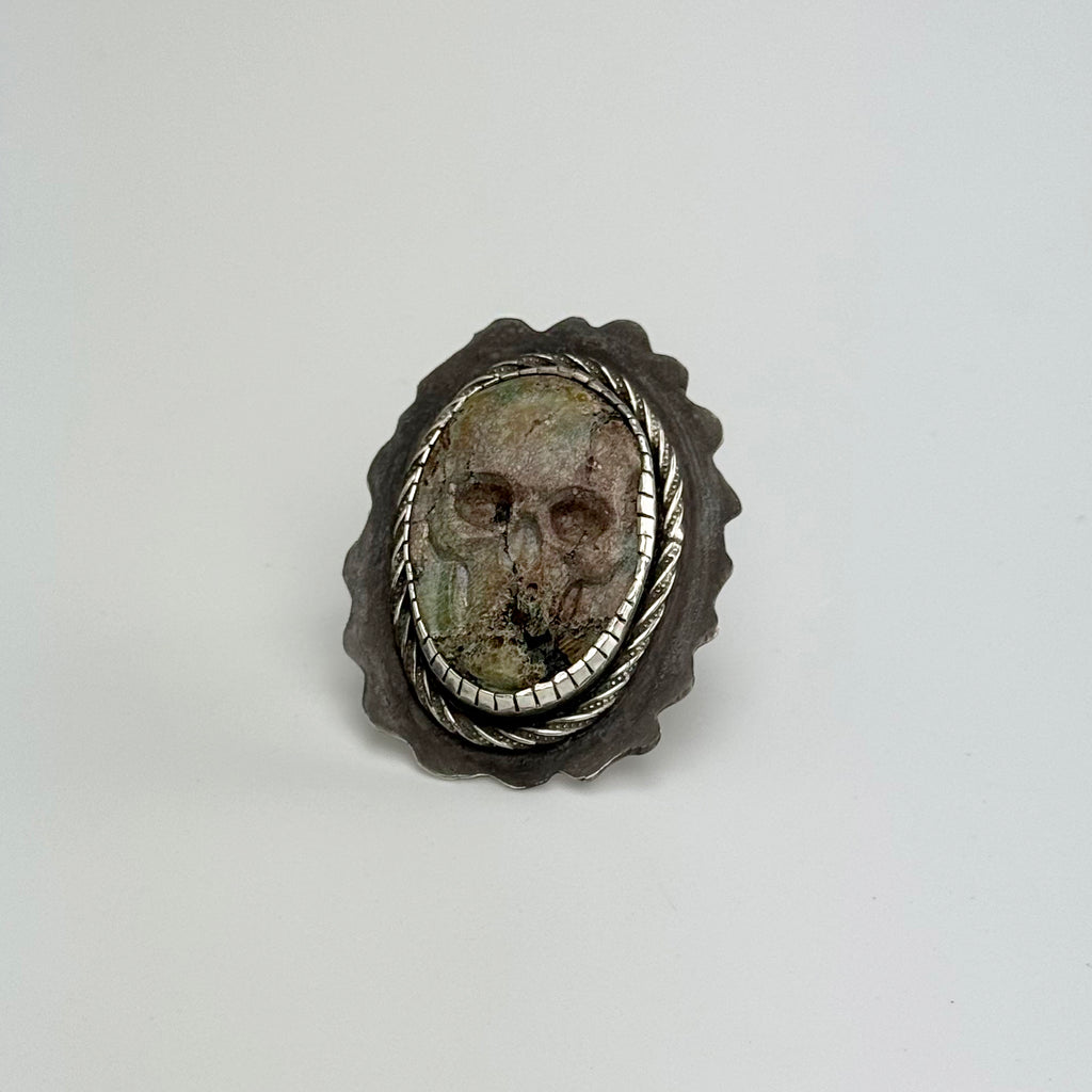 Light Green and Brown Turquoise Hand Carved Skull, Sterling Silver Ring