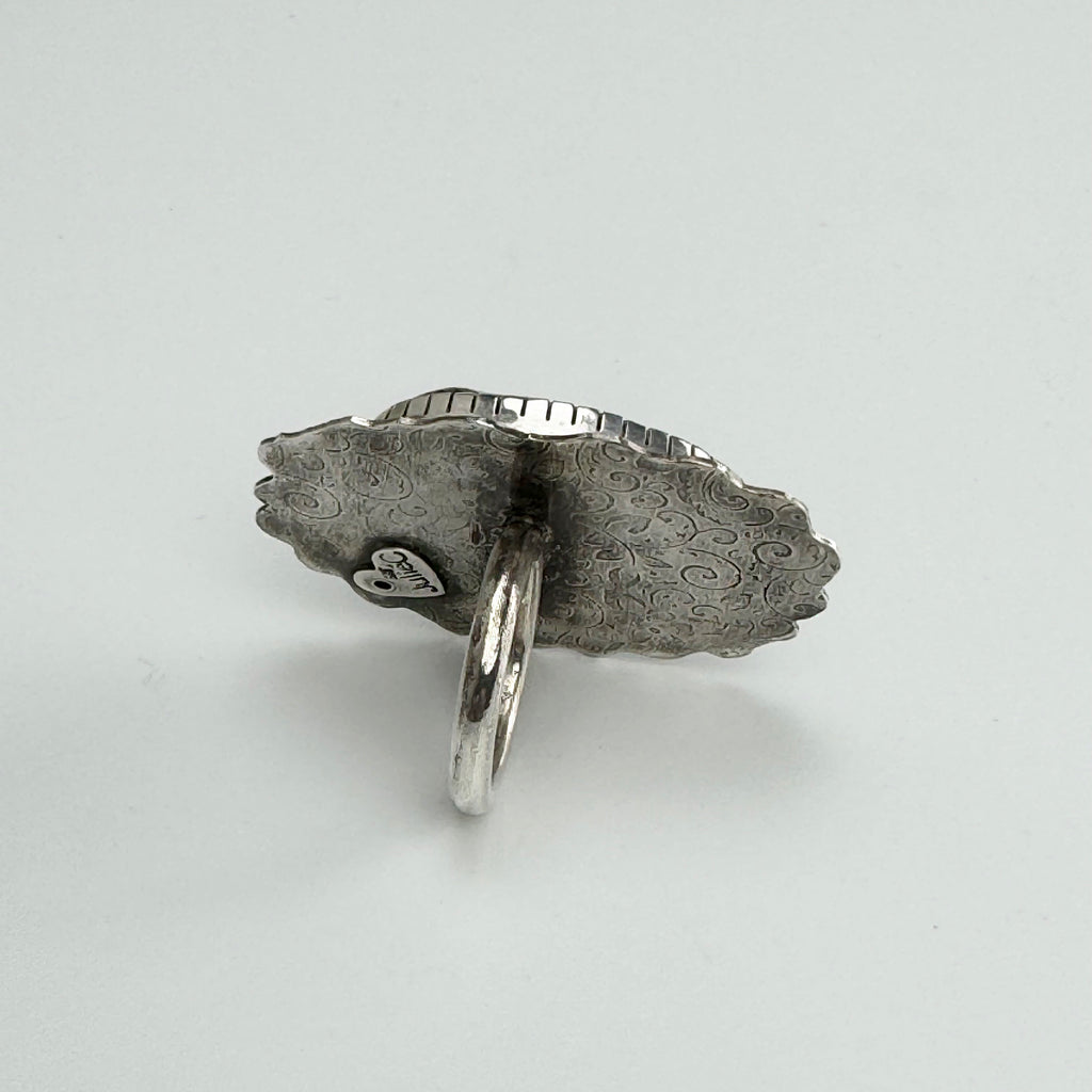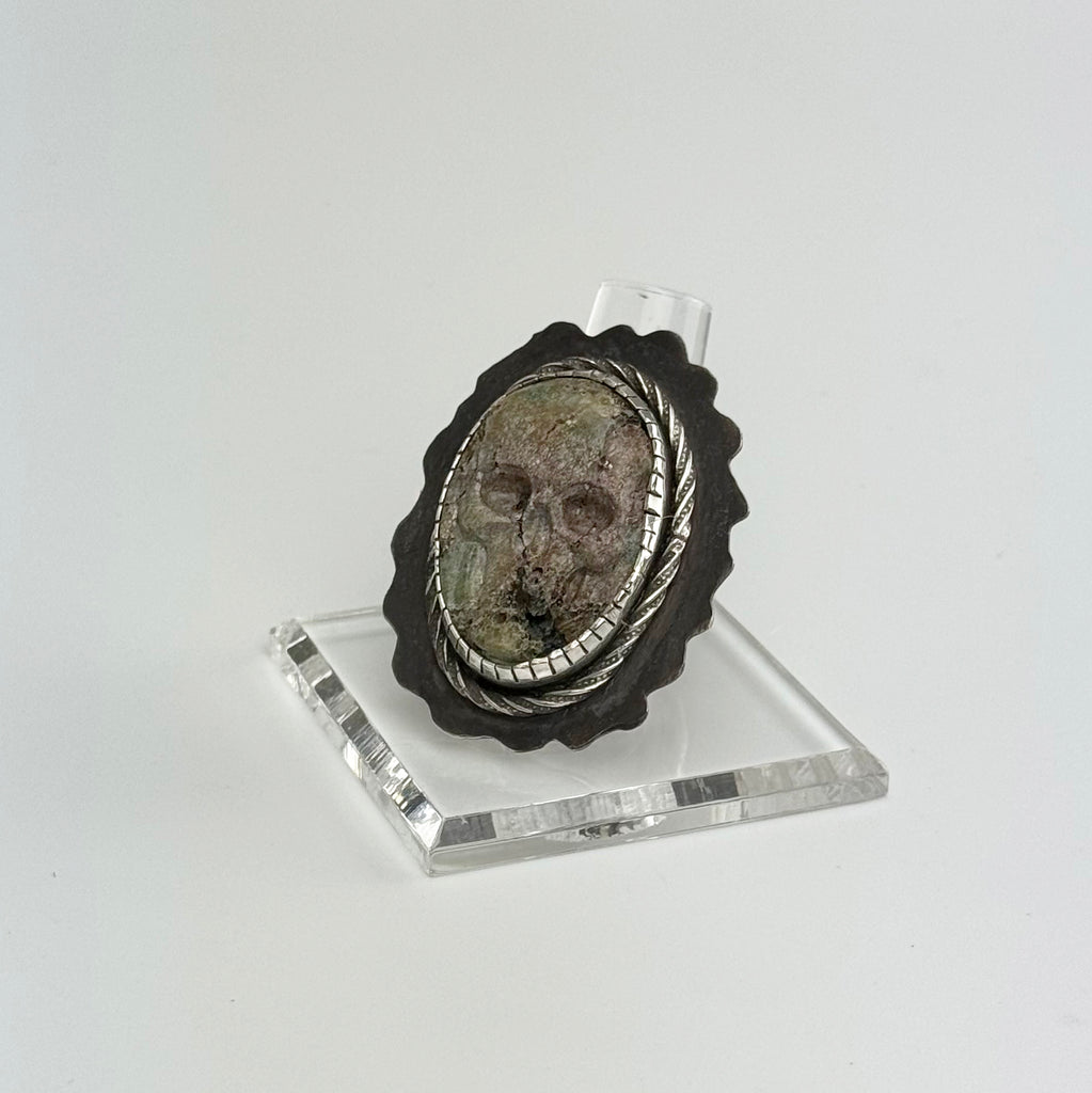 Add some edge to your style with this unique Light Green and Brown Turquoise Hand Carved Skull, Sterling Silver Ring. Hand carved for a one-of-a-kind look, this ring is perfect for those with a playful and edgy sense of style. Made with sterling silver and genuine turquoise, braided sterling wire surrounds a hand-cut bezel...it's sure to catch attention. Over-all dimensions 1.75" H X 1.5" W and US size 7 3/4