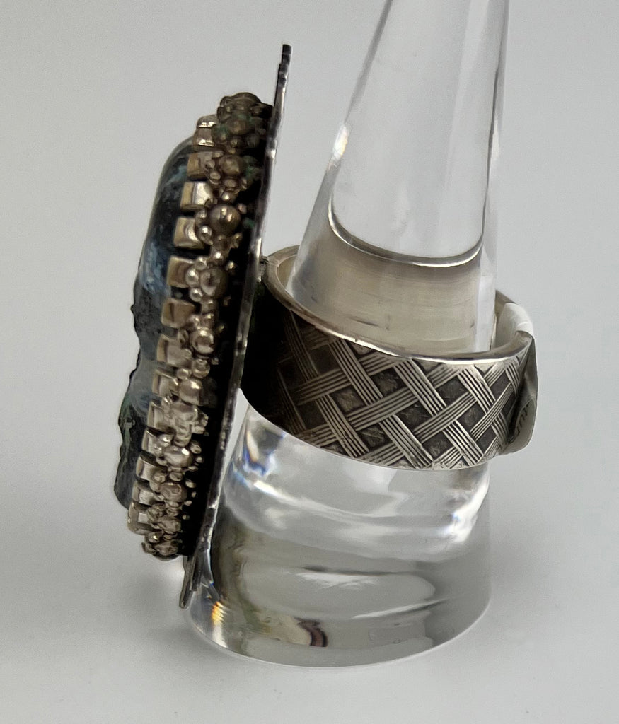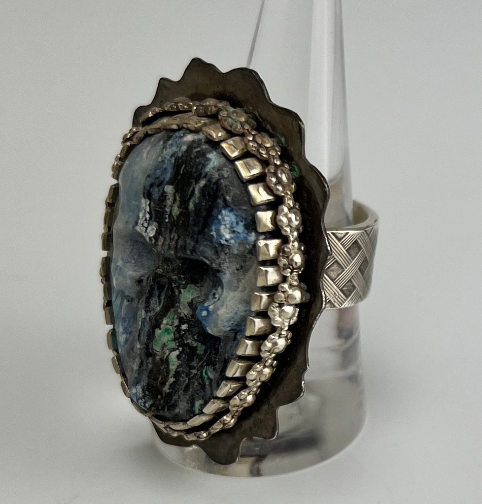 Spice up your jewelry collection with this unique Natural Hubei Turquoise Skull Ring. The 45.5 ct. turquoise stone adds a pop of color and the sterling silver skull design adds a touch of edginess to any outfit. Available in size 8.25, this ring is a must-have for any quirky and playful fashionista.