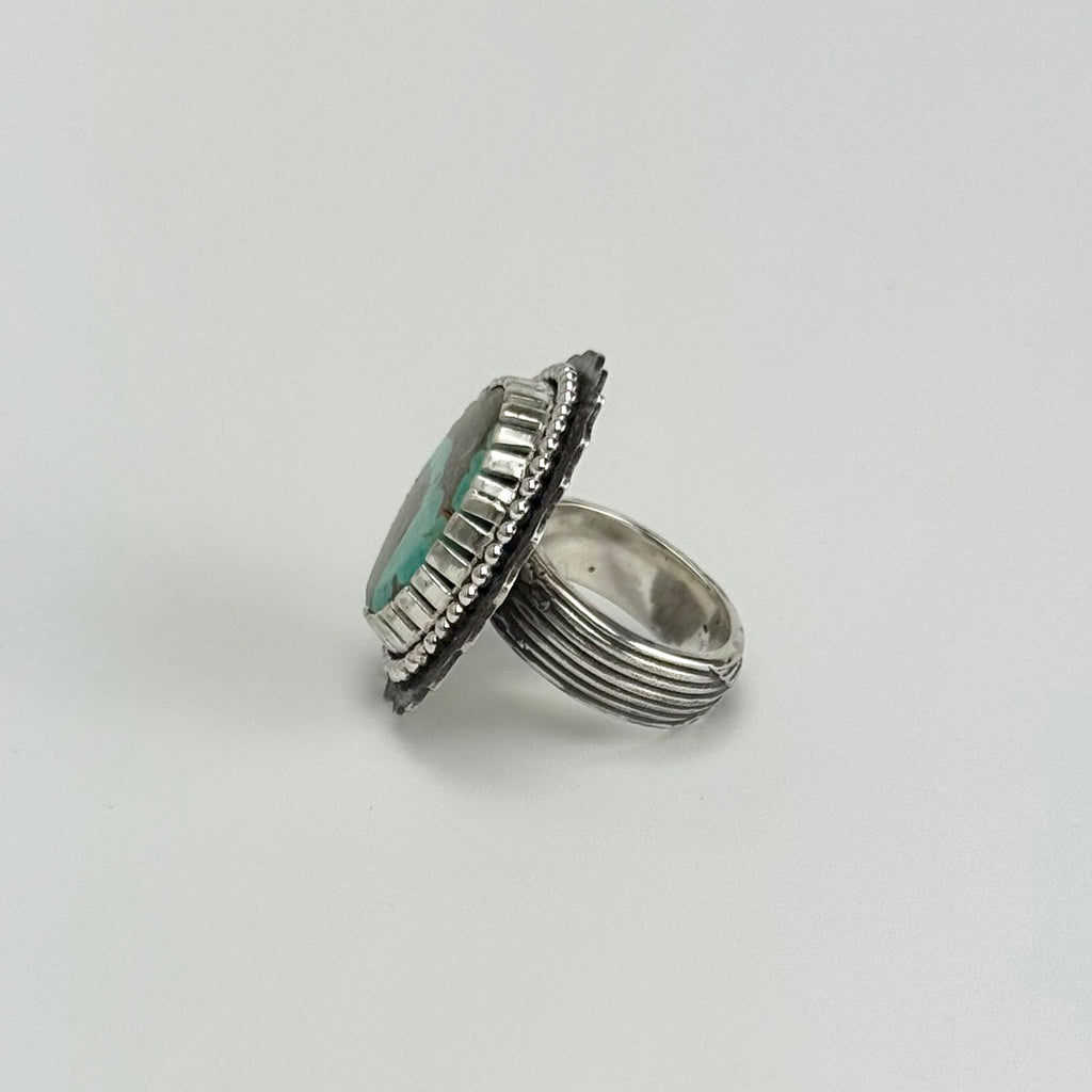 Experience bold beauty with our Round Tyrone Turquoise Ring! Made with genuine Tyrone Turquoise and sterling silver, this statement ring adds a pop of color to any outfit. A playful addition to your jewelry collection. It has a castellated bezel with a ball rope around the bezel