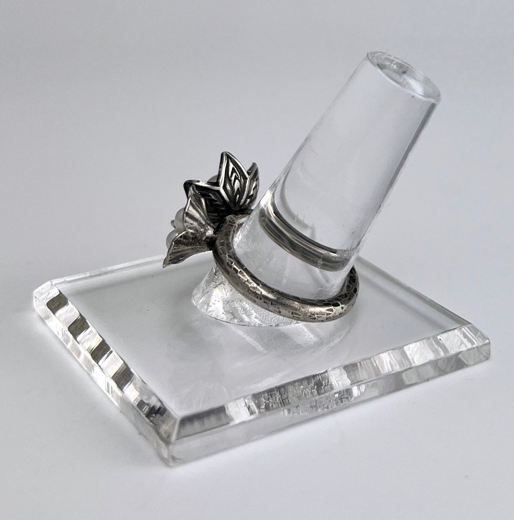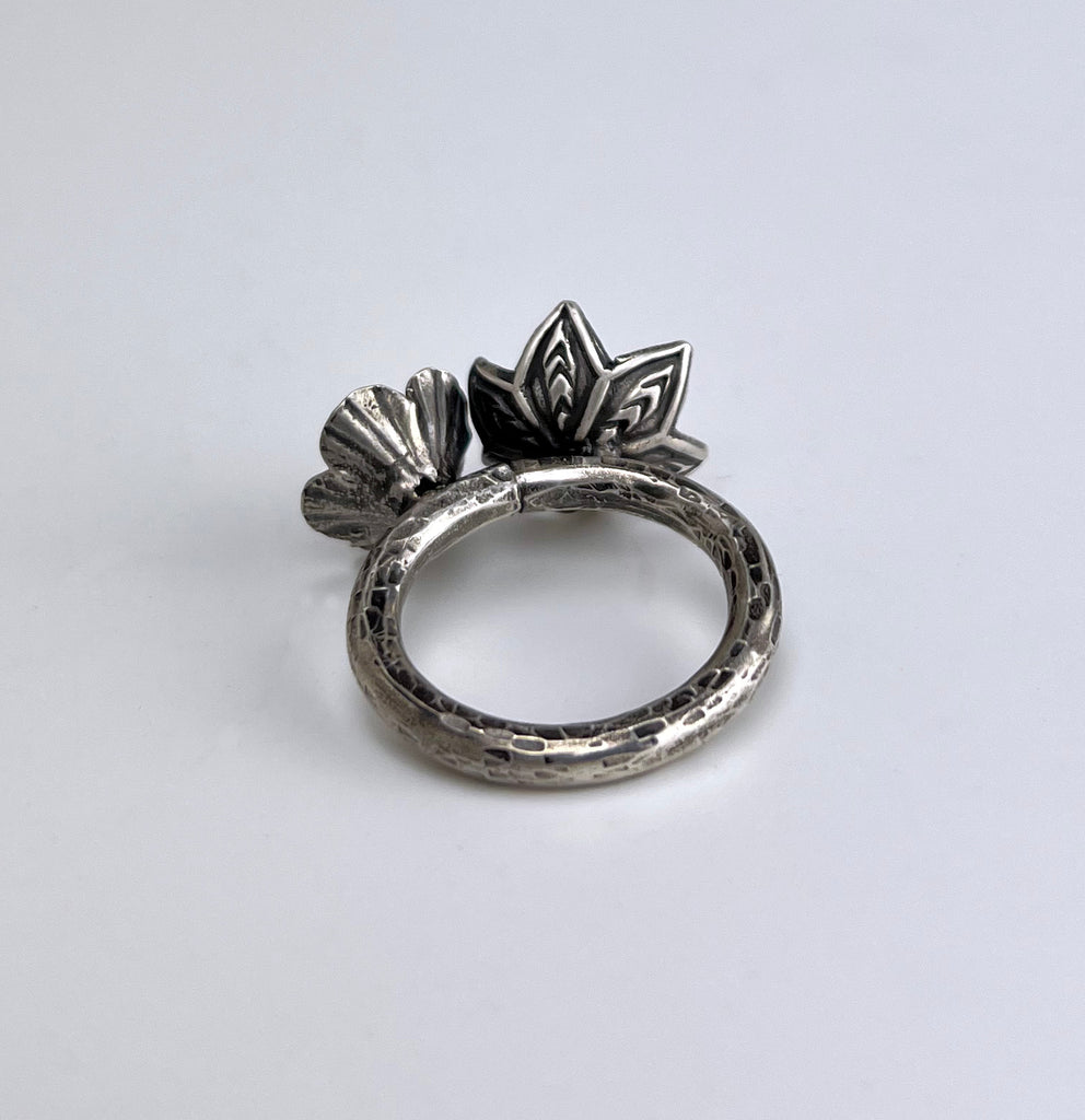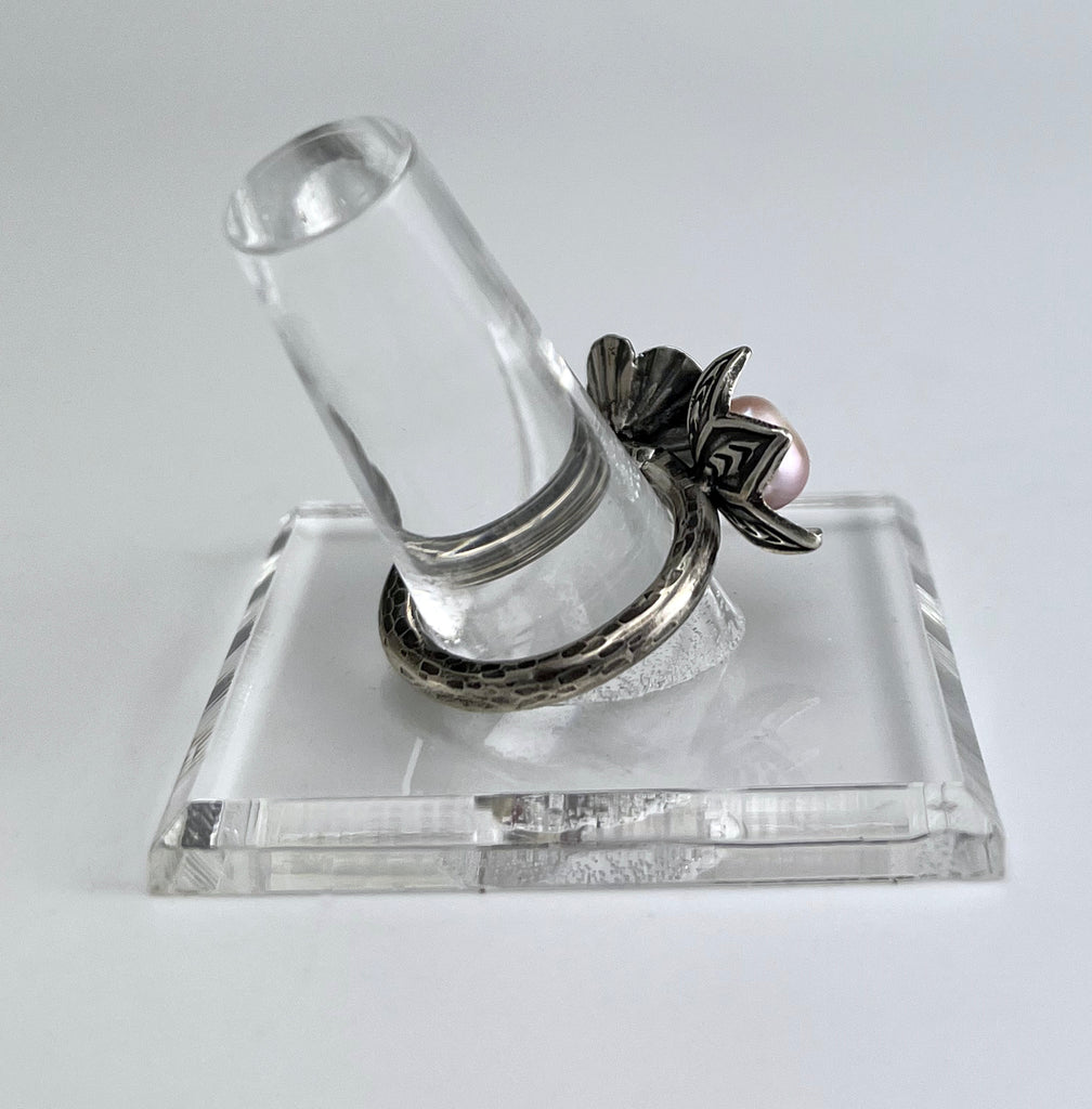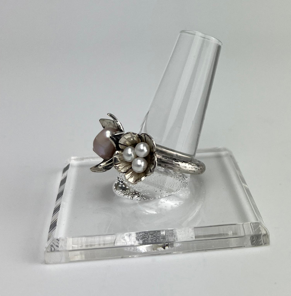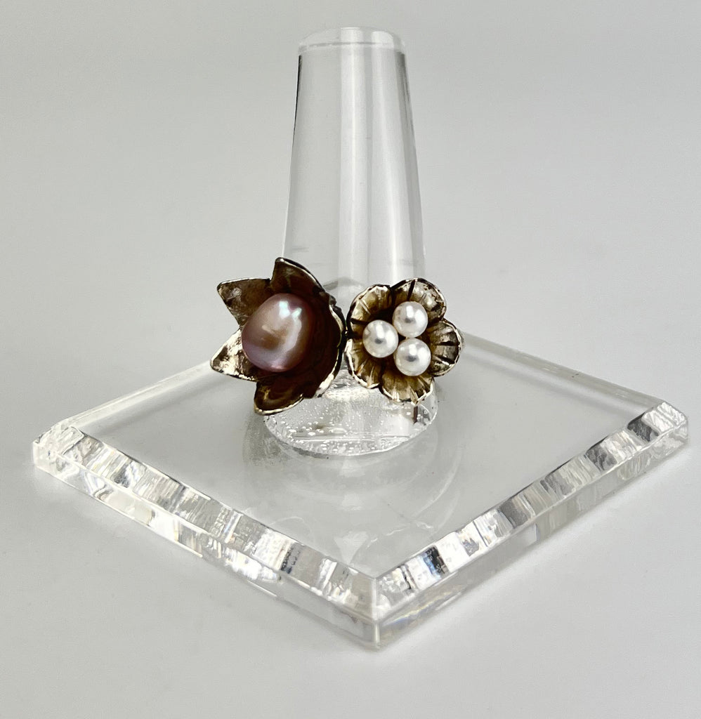 This stunning ring showcases two exquisite flowers - the Lotus and Poppy - beautifully crafted in sterling silver. The Lotus holds a single white pearl, while the Poppy boasts three delicate pearls. Sized perfectly at 8, this ring exudes sophistication with a playful touch. (Enhance your beauty with the perfect combination of flowers and pearls!)
